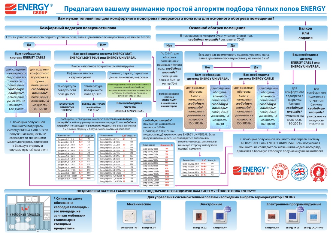 Для основного отопления подходят модели Energy Cable и Energy Universal. Для дополнительного отопления напольного покрытия - любые модели.
