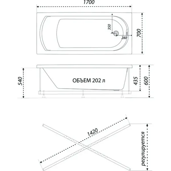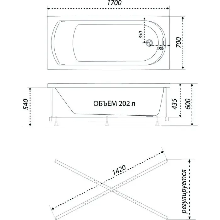 Акриловая ванна 1ACReal Дюна Щ0000046663 170x70 см на Х-каркасе белый