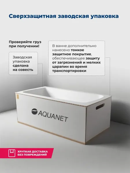 Акриловая ванна Aquanet создана с учетом растущего спроса на ванны простой прямоугольной формы в популярных размерах. Это модель с прямыми бортами и пологой спинкой, где соблюден идеальный угол для комфортного нахождения в ванне. Спинка плавно перетекает в бортик, поэтому релакс гарантирован даже без использования подголовника. Все линии ванны подчинены строгим законам эргономики. Чаша в этой ванне устроена таким образом, что для обозначенных размеров в ней достигнут максимально возможный внутренний объем, и это при комфортной глубине от слива ванны до борта. Ванна рассчитана на нагрузку свыше 300 кг, так что даже крепкий мужчина сможет без опаски находиться в ней. Двойной слой армирования обеспечивает надежность чаши, а закладные из МДФ-плит в местах наибольшей нагрузки усиливают эффект.