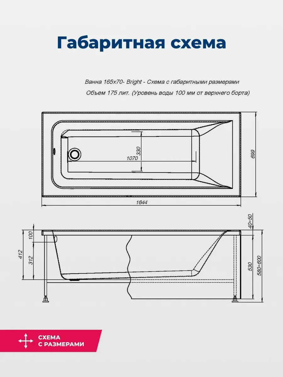 Акриловая ванна Aquanet Bright 165x70 создана с учетом растущего спроса на ванны простой прямоугольной формы в популярных размерах. Это модель с прямыми бортами и пологой спинкой, где соблюден идеальный угол для комфортного нахождения в ванне. Спинка плавно перетекает в бортик, поэтому релакс гарантирован даже без использования подголовника. Все линии ванны подчинены строгим законам эргономики. В современных условиях ширина ванны 70 см при длине 165 см - это наиболее востребованные габариты, так как прекрасно вписываются в стандартную планировку современных ванных комнат. Чаша в этой ванне устроена таким образом, что для обозначенных размеров в ней достигнут максимально возможный внутренний объем, а именно 175 литров, и это при комфортной глубине в 412 мм от слива ванны до борта. Ванна рассчитана на нагрузку свыше 300 кг, так что даже крепкий мужчина сможет без опаски находиться в ней. Двойной слой армирования обеспечивает надежность чаши, а закладные из МДФ-плит в местах наибольшей нагрузки усиливают эффект.