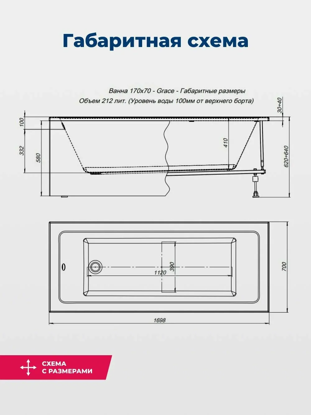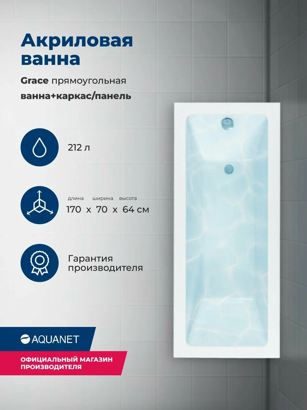 Акриловая ванна Aquanet Grace 347149 170x70 см с каркасом и фронтальной панелью купить