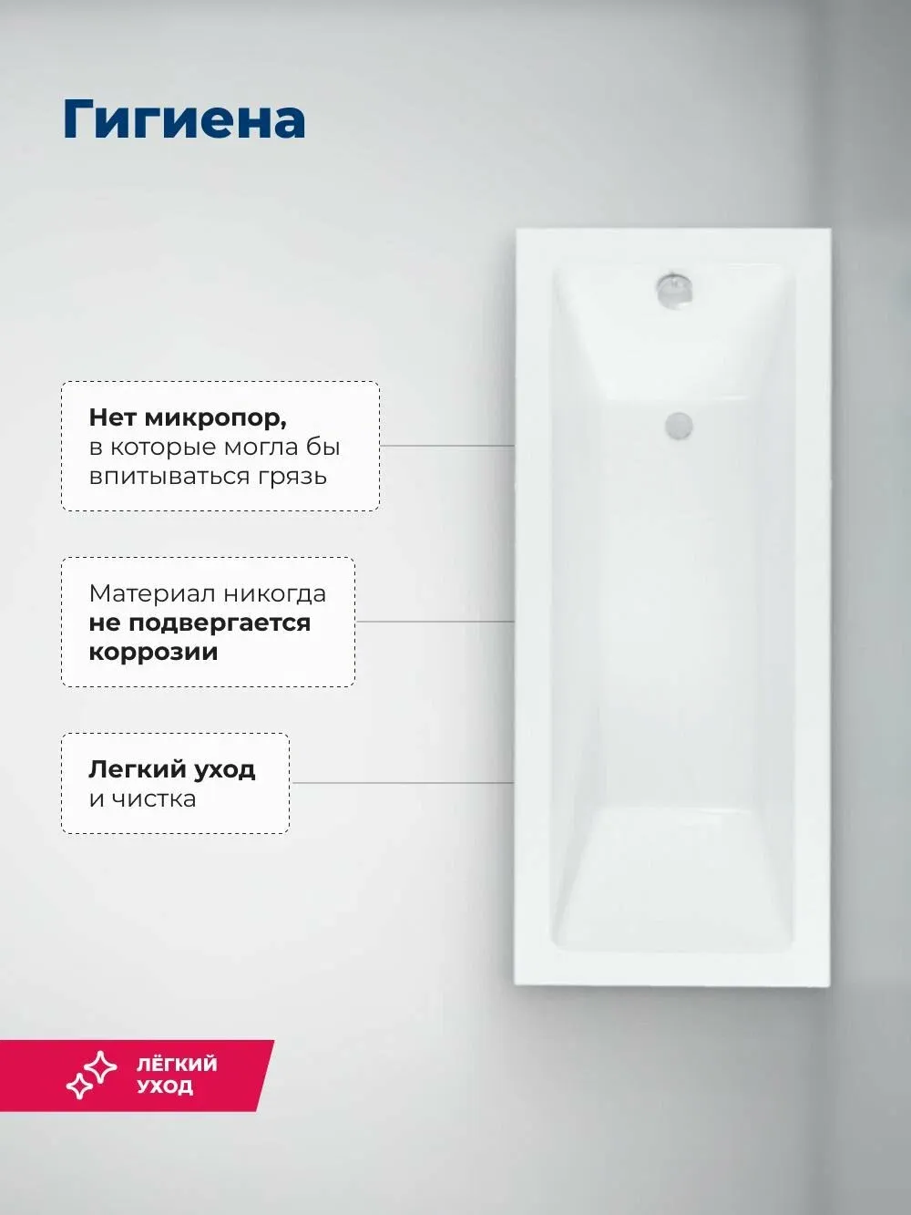 Пологая спинка спроектирована таким образом, что обеспечиваются комфорт и расслабление мышц тела. Расположение слива стандартное — в области ног. Модель установлена на прочный и устойчивый металлический каркас с регулируемыми ножками, позволяющими расположить ее на удобной высоте. Чтобы закрыть пространство под ванной, можно использовать панели: фронтальную и/или боковую.