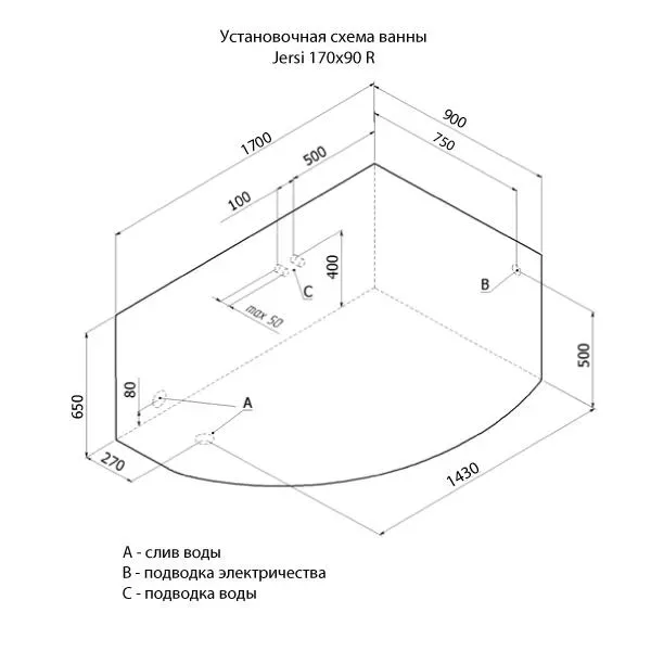 Акриловая ванна Aquanet Jersey 203989 170x90 см правая