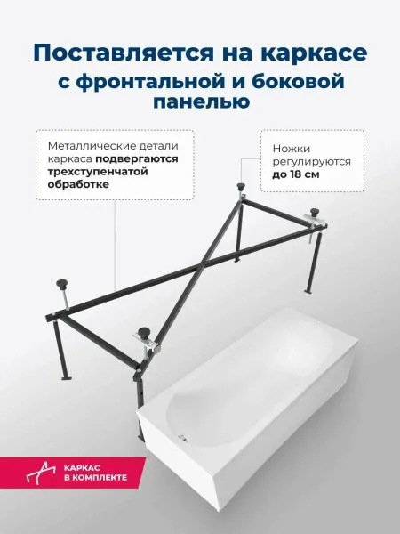 Овальная чаша со стандартным сливом дополнена расположенной под углом спинкой, переходящей в прямые широкие бортики. Выверенная до мелочей эргономика обеспечивает комфортное принятие водных процедур, позволяет держать под рукой необходимые гигиенические принадлежности. Устойчивость придает прочный металлический каркас, оптимальную высоту которого можно подобрать за счет регулируемых ножек.