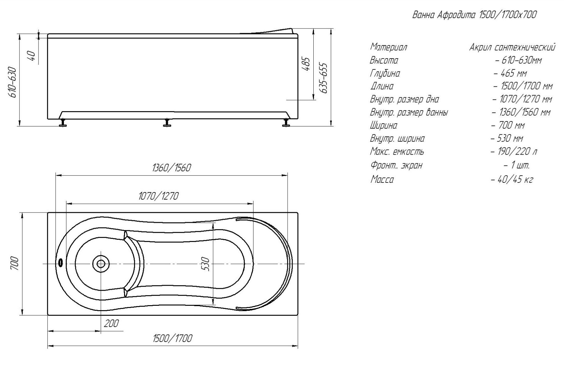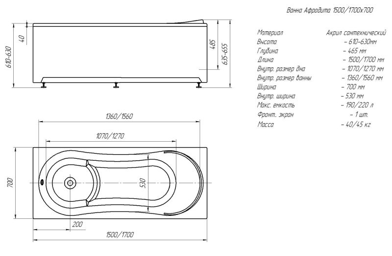 Габариты (Д Ш), см: 150х70Высота с опорой, см: 68Объем, л: 190 Форма: прямоугольнаяМонтаж: пристеннаяРасположение перелива: стандартноеДиаметр слива ванны, см: 5,2Материал: 100% литьевой акрилТолщина акрилового листа, мм: 4Гарантия: 20 летСтрана: Россия Вид опоры: каркас сборно-разборный сварной, есть в комплектеЭкран: фронтальный и боковой, приобретаются отдельноСлив-перелив: есть, в комплектеАнтискользящее покрытие: нескользкая поверхностьПодголовник: приобретается отдельноРучки: приобретаются отдельно Система гидромассажа: установка по желаниюАэромассаж: установка по желаниюХромотерапия: установка по желаниюРучки, поручни для ванны: установка по желаниюВстроенные смесители: установка по желаниюИзменение конструкции каркаса: установка по желаниюОзонирование: нет, установка не предусмотренаЗащита от сухого пуска: установка по желанию