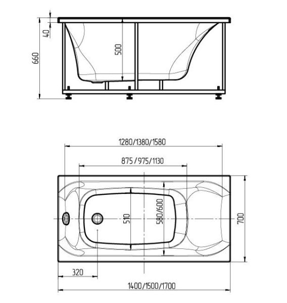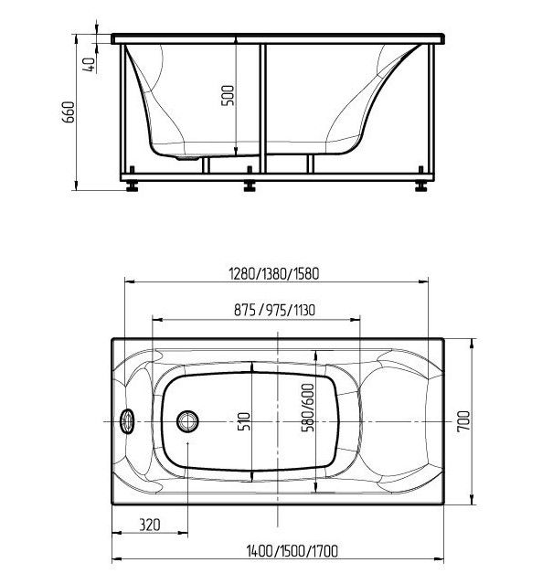 Габариты (Д Ш), см: 170х70Высота с опорой, см: 66Объем, л: 280 Форма: прямоугольнаяМонтаж: пристеннаяРасположение перелива: стандартноеДиаметр слива ванны, см: 5,2Материал: 100% литьевой акрилТолщина акрилового листа, мм: 4Гарантия: 20 летСтрана: Россия Вид опоры: каркас сборно-разборный сварной, есть в комплектеЭкран: фронтальный, есть в комплектеЭкран боковой: нет, приобретаются отдельноСлив-перелив: есть, в комплектеПодголовник: приобретается отдельноРучки: приобретаются отдельно Система гидромассажа: установка по желаниюАэромассаж: установка по желаниюХромотерапия: установка по желаниюРучки, поручни для ванны: установка по желаниюВстроенные смесители: установка по желаниюИзменение конструкции каркаса: установка по желаниюОзонирование: нет, установка не предусмотренаЗащита от сухого пуска: установка по желаниюУправление: любое по желанию