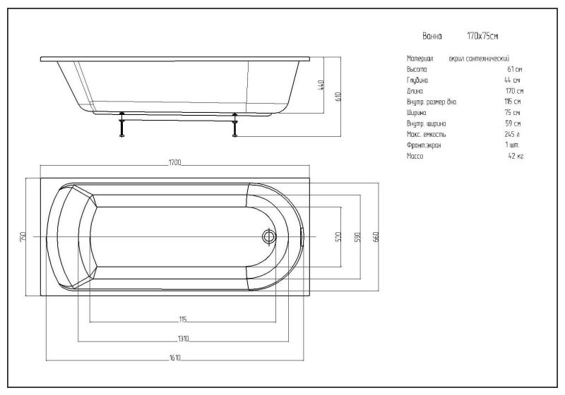 Габариты (Д Ш), см: 170х75Высота с опорой, см: 62Объем, л: 245 Форма: прямоугольнаяМонтаж: пристеннаяРасположение перелива: стандартноеДиаметр слива ванны, см: 5,2Материал: 100% литьевой акрилЦвет: белыйГарантия: 20 летСтрана: Россия Вид опоры: каркас сборно-разборный металлический (шпильки) или опорная конструкция (ножки), приобретается отдельноЭкран: фронтальный и боковой, приобретаются отдельноСлив-перелив: нет, приобретается отдельноНескользкая поверхность