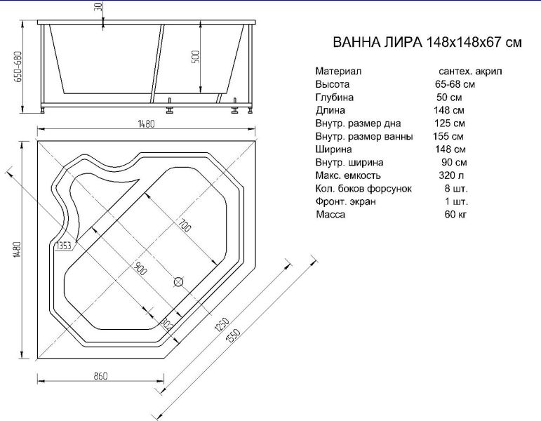 Габариты (Д Ш), см: 150х150Высота с опорой, см: 68Объем, л: 320 Форма: угловаяМонтаж: пристеннаяРасположение перелива: стандартноеДиаметр слива ванны, см: 5,2Материал: 100% литьевой акрилТолщина акрилового листа, мм: 4Гарантия: 20 летСтрана: Россия Вид опоры: Каркас вклеенный цельносварной металлический, в комплектеЭкран: фронтальный, в комплектеСлив-перелив: есть, в комплектеАнтискользящее покрытие: нескользкая поверхностьПодголовник: приобретается отдельноРучки: приобретаются отдельно Система гидромассажа: установка по желаниюАэромассаж: установка по желаниюХромотерапия: установка по желаниюРучки, поручни для ванны: установка по желаниюВстроенные смесители: установка по желаниюИзменение конструкции каркаса: установка по желаниюОзонирование: нет, установка не предусмотренаЗащита от сухого пуска: установка по желаниюУправление: любое по желанию
