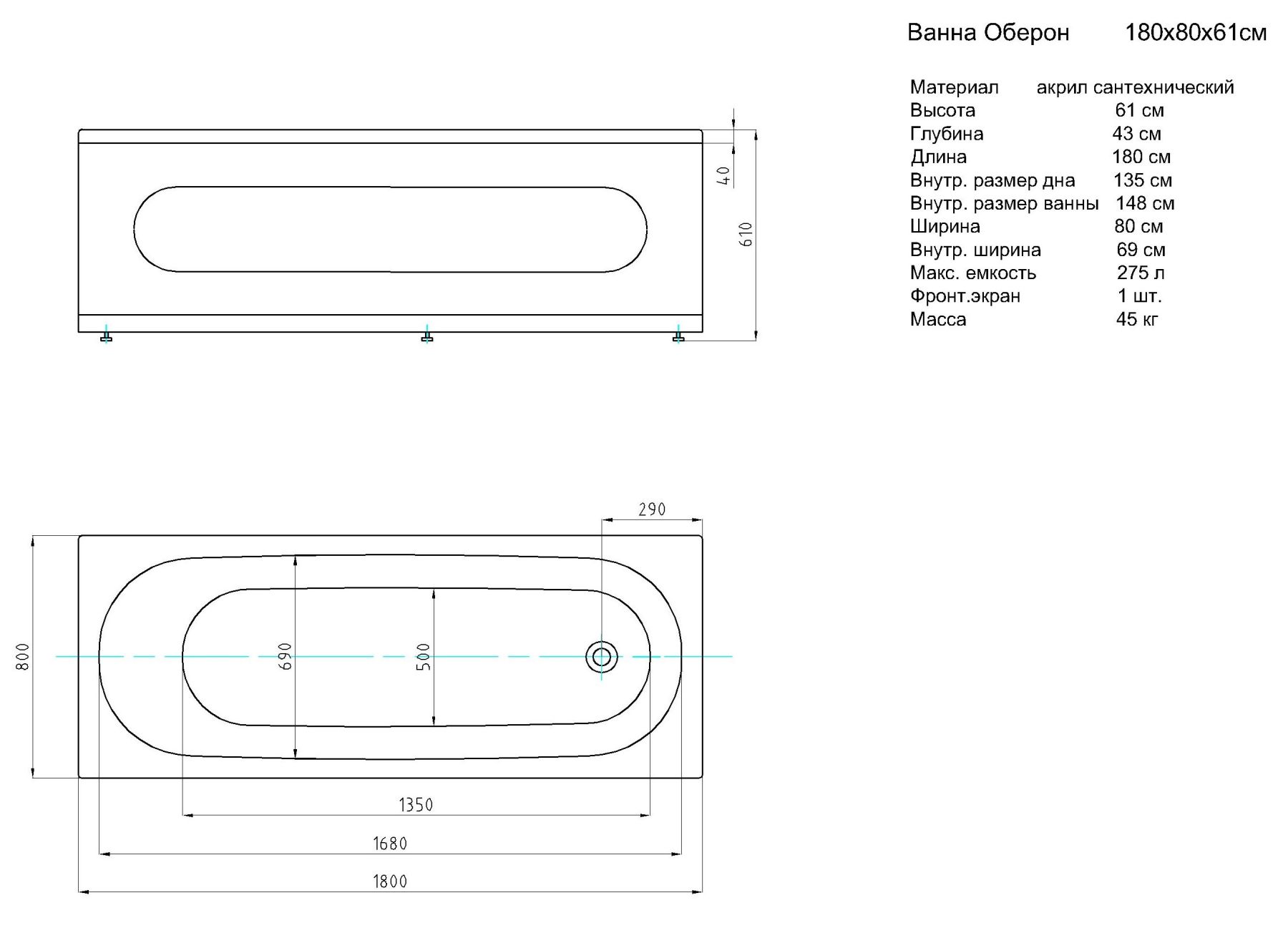 Габариты (Д Ш), см: 180х80Высота с опорой, см: 61Объем, л: 275 Форма: прямоугольнаяМонтаж: пристеннаяРасположение перелива: стандартноеДиаметр слива ванны, см: 5,2Материал: 100% литьевой акрилТолщина акрилового листа, мм: 4Гарантия: 20 летСтрана: Россия Вид опоры: каркас сборно-разборный сварной, есть в комплектеЭкран: фронтальный в комплектеСлив-перелив: есть, в комплектеАнтискользящее покрытие: нескользкая поверхностьПодголовник: приобретается отдельноРучки: приобретаются отдельно Система гидромассажа: установка по желаниюАэромассаж: установка по желаниюХромотерапия: установка по желаниюРучки, поручни для ванны: установка по желаниюВстроенные смесители: установка по желаниюИзменение конструкции каркаса: установка по желаниюОзонирование: нет, установка не предусмотренаЗащита от сухого пуска: установка по желаниюУправление: любое по желанию