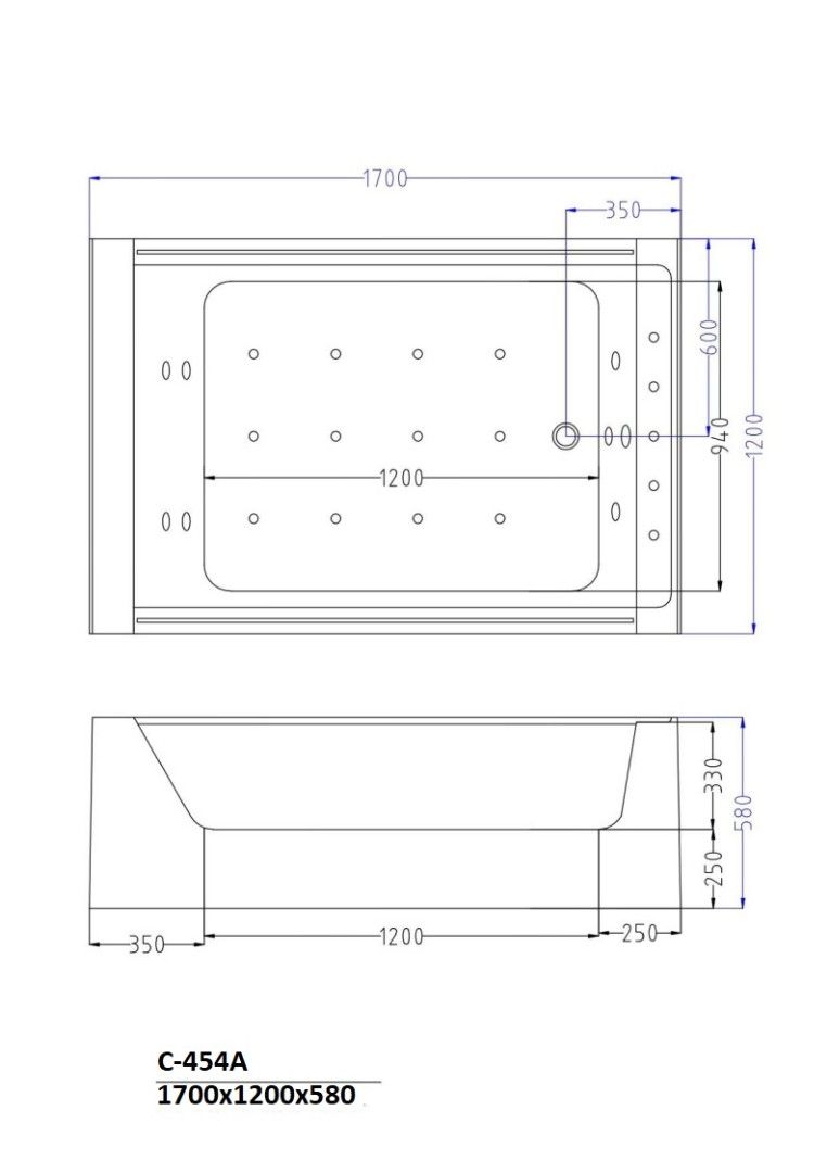 Акриловая гидромассажная ванна (джакузи) Ceruttispa C-454А (1700х1200х580), 6 гидромассажных форсунок в зоне спины, 2 в боковой зоне, 12 аэромассажных форсунок, смеситель, 2 подголовника, хромотерапия, с датчиком сухого пуска.Размер: 1700x1200x580 ммОснащение:Гидромассажные форсунки : 6 штук в зоне спины + 2 в боковой зоне.