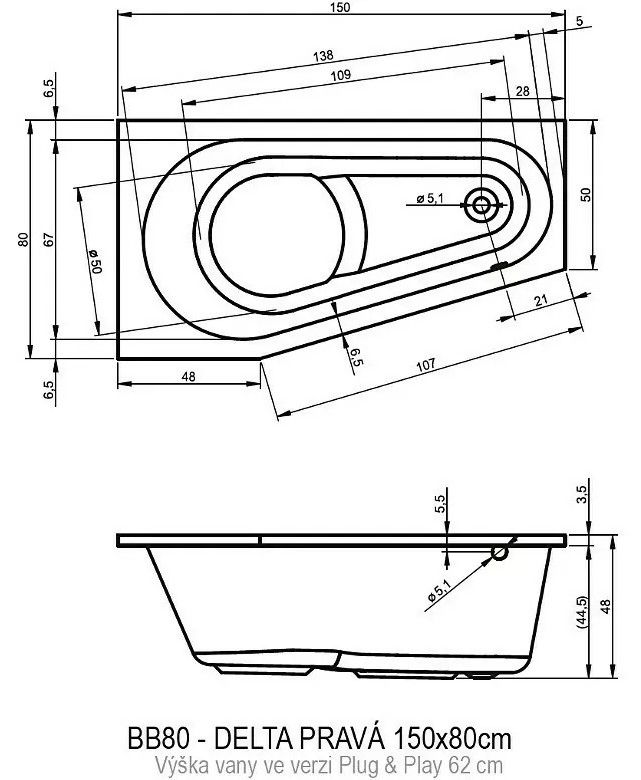 ?Асимметричная ванна RIHO Delta 150 R Plug & Play из глянцевого белого акрила, со скошенными краями представляет собой полностью собранную на заводе конструкцию.