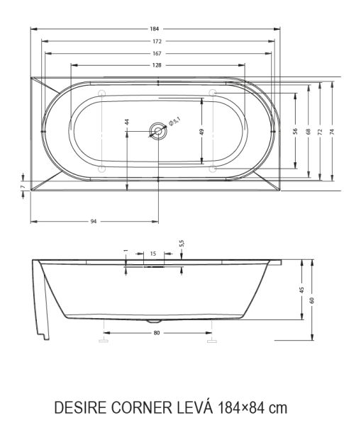 Акриловая ванна Riho Desire Corner Glossy Sparkle System Fall B088009005 L 184x84см с аэромассажем заполнение через перелив белый