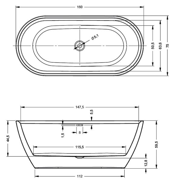Отдельно стоящая, матовая чёрная акриловая ванна RIHO Inspire 160х75 с двойными стенками, со встроенным переливом и нажимным донным клапаном.