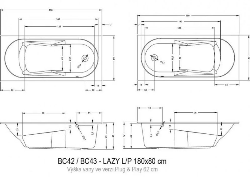 Прямоугольная? ванна RIHO Lazy 180x80 L Plug & Play, из глянцевого белого акрила с боковым сливом-переливом, представляет собой полностью собранную на заводе конструкцию.