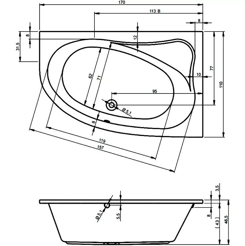 Акриловая ванна Riho Lyra B018001005 L 170х110см белый