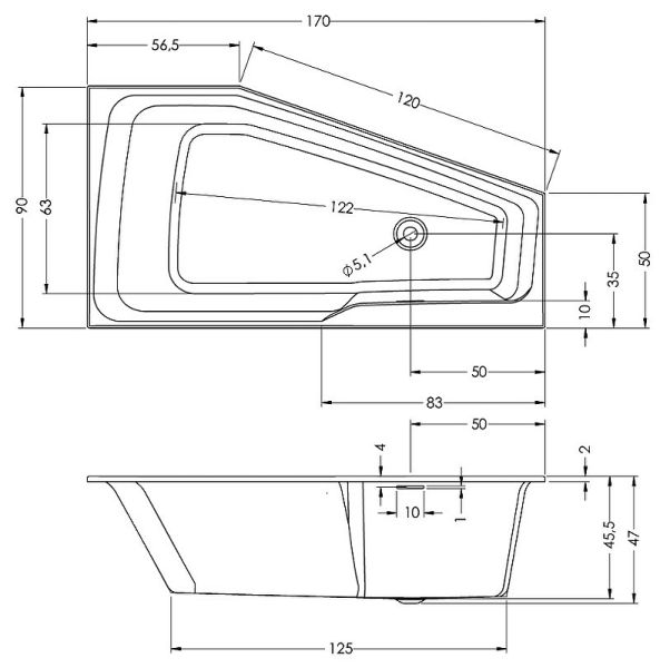 Ванна асимметричная левая, сливное отверстие слева