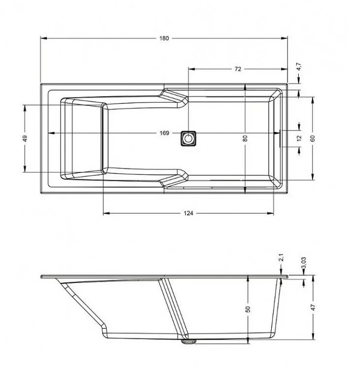 Слив смещён к центру, перелив расположен сбоку, поэтому ванну можно разместить как в правом, так и в левом углу.