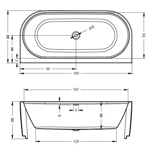 Отдельно стоящая пристенная, глянцевая белая акриловая ванна RIHO DESIRE BACK2WALL 180х84 LED с двойными стенками, со встроенным переливом и нажимным донным клапаном.