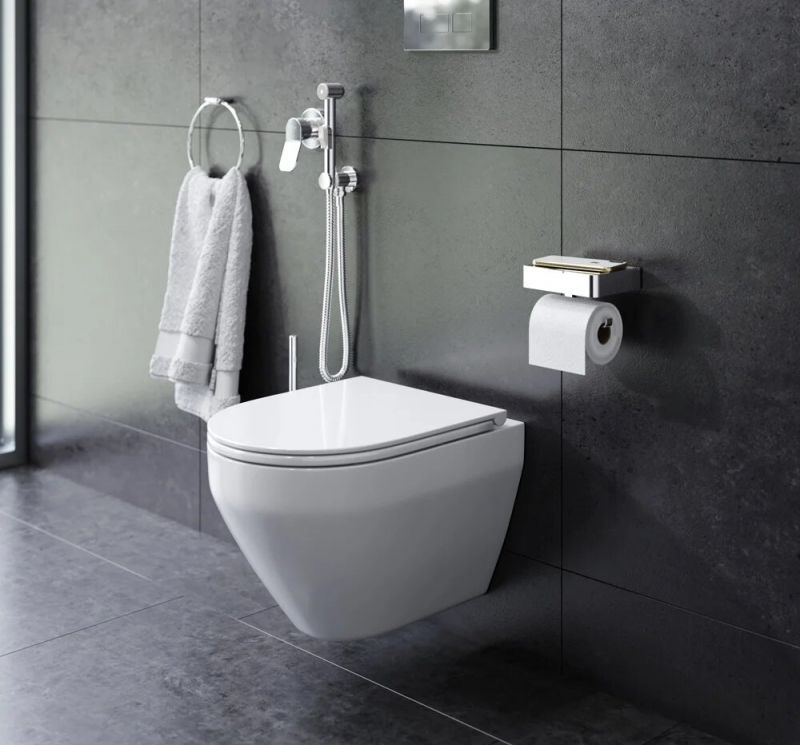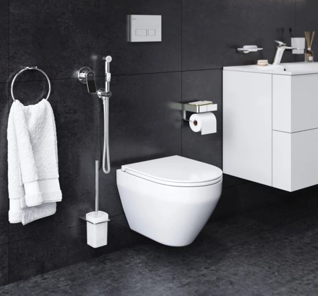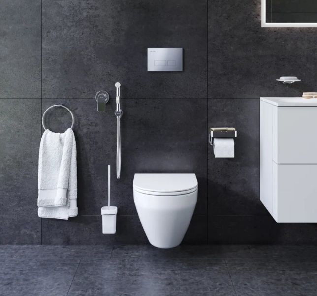 Комплект включает в себя: стильный смеситель для душа, монтируемый в стену, шланговое присоединение с боковым расположением держателя для гигиенической лейки, гигиеническая лейка, душевой шланг 1 500 мм. Завершают комплект инновационные аксессуары. Обтекаемая форма и стильные элементы из ультратонкого сверхпрочного стекла напоминают современные смартфоны внешне и тактильно. Продуманный дизайн и удивительные детали – отделение для хранения в держателе для туалетной бумаги.Чаша унитаза с сиденьем:Изготовлен из стекловидного фарфора - гигиеничного и влагостойкого материала. Унитаз прост в уходе, не впитывает загрязнения и неприятные запахи.