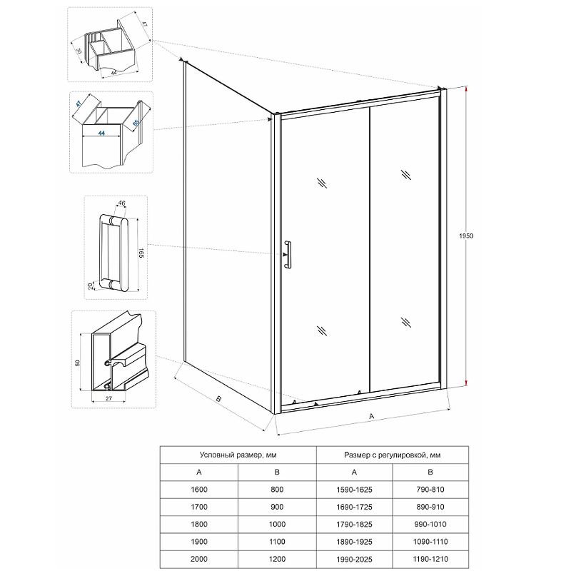 Боковая панель Veconi KP-13, 1000х1950 , хром, стекло прозрачное