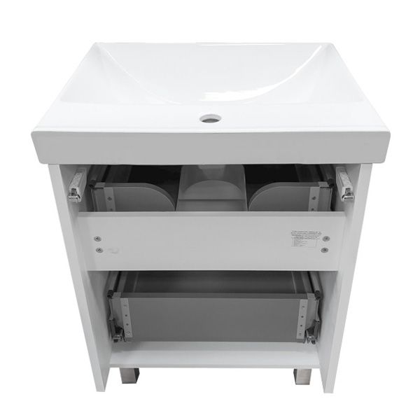 Название: Тумба-умывальник Артикул: Дублин 60 Варианты цвета корпуса: Белый глянец Материал корпуса: влагостойкое ЛДСП Цвет фасада ящиков: Белый глянец Материал фасада: МДФ Габариты (ШхВхГ): 605*850*460 мм Комплектация: раковина Comforty 8056 Напольная тумба с двумя выдвижными ящиками оснащенными системой плавного закрывания. Фасады покрыты белой глянцевой эмалью.