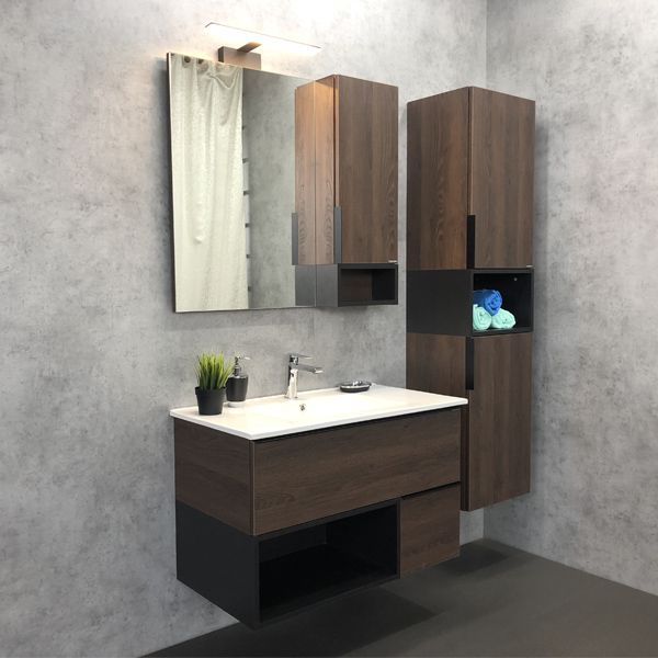 Тумба-умывальник в современном стиле с двумя выкатными ящиками и пространством для открытого хранения. Ящики оснащены системой плавного закрывания. Тумба укомплектована черными матовыми алюминиевыми ручками и столешницей и накладной прямоугольной раковиной из санфарфора. Тумба подготовлена для подключения водоснабжения снизу.