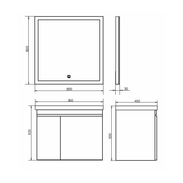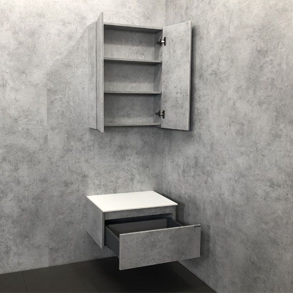 Подвесная тумба-умывальник шириной 80 см с распашной дверцей и глубоким выдвижным ящиком для хранения принадлежностей для умывания и бытовой химии. Петли створки и направляющие ящика оснащены механизмами плавного закрывания. Фасады и корпус из влагостойкого ЛДСП цвета бетон светлый.