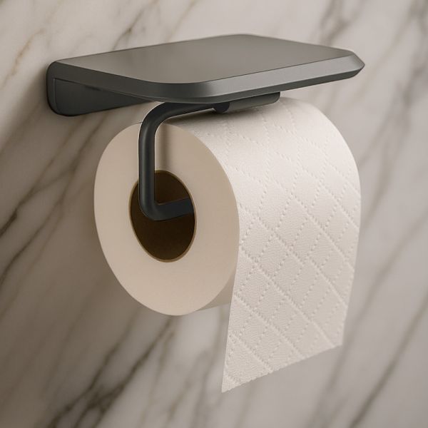 Держатель для туалетной бумаги в  вороненой стали — всё под рукой благодаря полочке для телефона и аксессуаров. Простая установка, долговечный материал, современный стиль.
