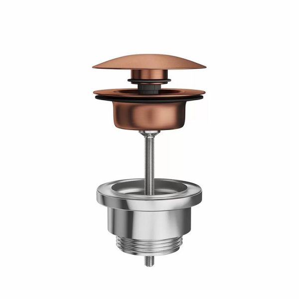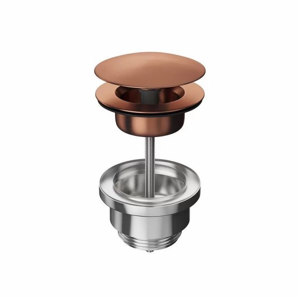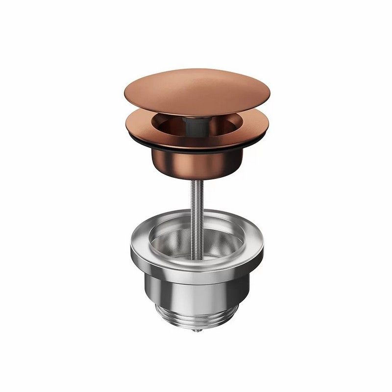 Донный клапан для раковины выполнен из нержавеющей стали AISI 316: этот металл обладает особой устойчивостью к механическим воздействиям, гипоаллергенен, не подвержен коррозии. Нажатие на клапан закрывает его, повторное нажатие открывает. Верхняя часть клапана выполнена с покрытием  брашированная медь : это металлический слой, наносимый по технологии вакуумного напыления (PVD) и отличающийся высокой стойкостью.