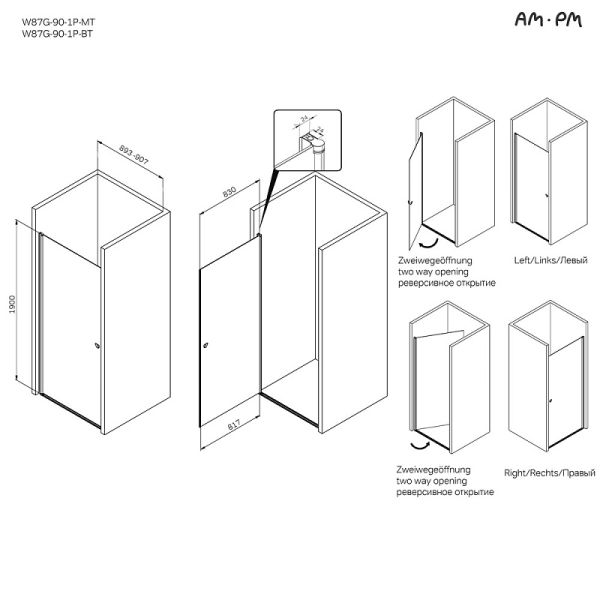 Душевая дверь AM.PM Sunny W87G-90-1P-BT прозрачное стекло профиль черный матовый 90x190Душевые двери в нишу из коллекции Sunny сделают ванную комнату вашим тайным местом силы и перезагрузки. Эстетика и функциональность - то, что моментально приковывает взгляды. Исключительный дизайн, к которому хочется прикоснуться. Цвет профиля - черный матовый. Размер (Ш/Г/В): 900x24x1900 мм. Материал перегородки с дверью - прозрачное стекло, алюминий. Толщина стекла - 5 мм.