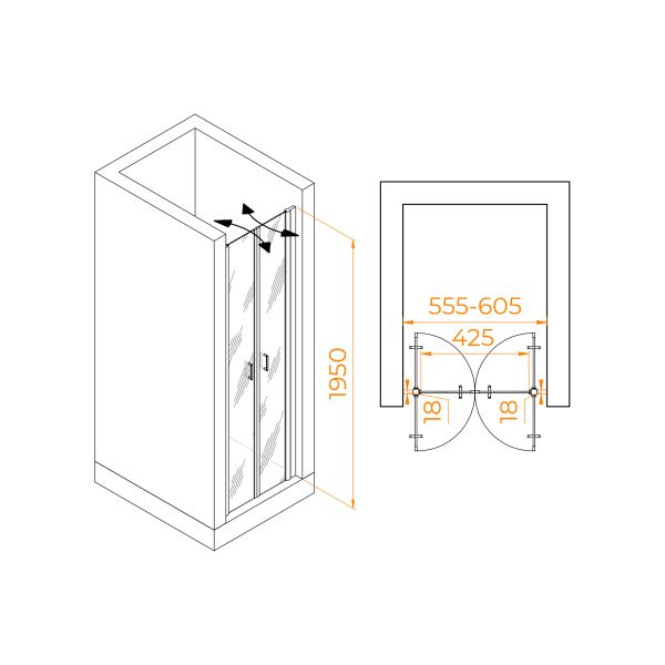 Душевая дверь распашная двустворчатая маятниковая. Маятниковые петли с функцией подъема двери. В комплекте нижняя пороговая планка. Трап или поддон приобретается отдельно.