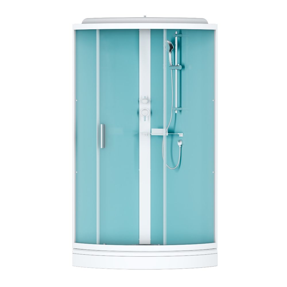 Кабина оснащена качественными комплектующими: двойными металлическими роликами для плавного движения дверей, верхним душем для равномерного распределения воды и ручной лейкой с держателем, угол наклона которого можно изменять. Функциональная полка предоставляет удобное место для хранения косметических средств. Несмотря на отсутствие гидромассажа, модель предлагает все необходимое для комфортного принятия душа.
