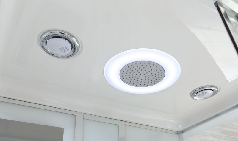 Форсунки гидромассажа, лейки мобильного и тропического душа в едином концептуальном стиле;