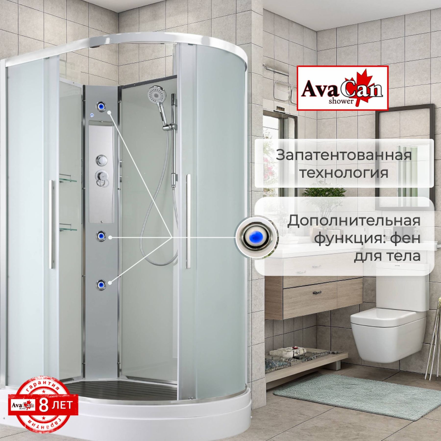 Стильная душевая кабина AvaCan EM2812LN сочетает в себе высокую функциональность, практичность и надежность. При изготовлении применяется безопасное закаленное стекло толщиной 5 мм (матовое), надежно фиксируемое алюминиевым профилем. Сборка без силикона (увеличивает срок службы), внутренняя сборка(облегчает установку и ревизию; позволяет установить в ограниченном пространстве), смеситель резьбовой (без хомутов). Съемный экран поддона (позволяет осуществлять ревизию сифона). Цвет профиля  хром. Двойные металлические ролики дверей (увеличивают срок службы).В комплекте : душевая штанга, две полочки , арома-лейка с витамином С (картридж съемный),полимерная вставка в поддон(имитация дерева),сифон, ручки дверей из нержавейки , двойные ролики .
