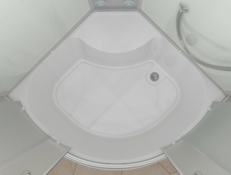 Кабина оснащена функцией верхний «тропический душ», которая смешивает струи воды с потоками воздуха – такой тип душа обладает массажным эффектом и благотворно влияет на организм. Для дополнительного удобства в кабине предусмотрены полочка и зеркало.