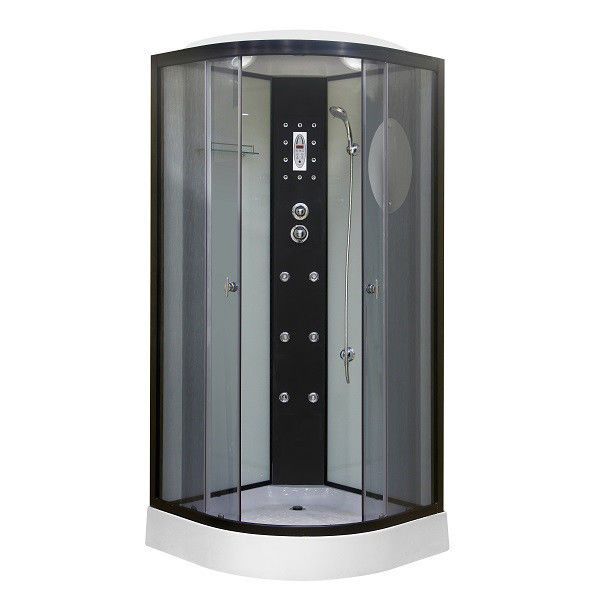 Поддон акриловый низкий 16см, глубина 5см, сифон с гофрой,экран несъемный,профиль черный,центральная панель черная, задние стенки закаленные,белые,крашенные, передние стекла закаленные,тонированные, смеситель 3-х режимный,полочка,пульт, подсветка, верхний душ,ручной душ,зеркало,гидромассаж