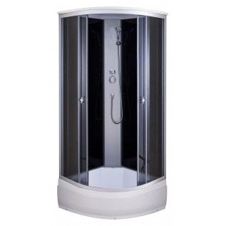 Поддон акриловый средний 26см(без сиденья на поддоне),глубина 13 см,сифон с гофрой,экран съемный, профиль матовый хром, центральная панель серебро, задние стенки закаленные, черные,крашенные,передние стекла закаленные,тонированные, смеситель 2-х режимный,тропический душ,ручной душ, полочка.