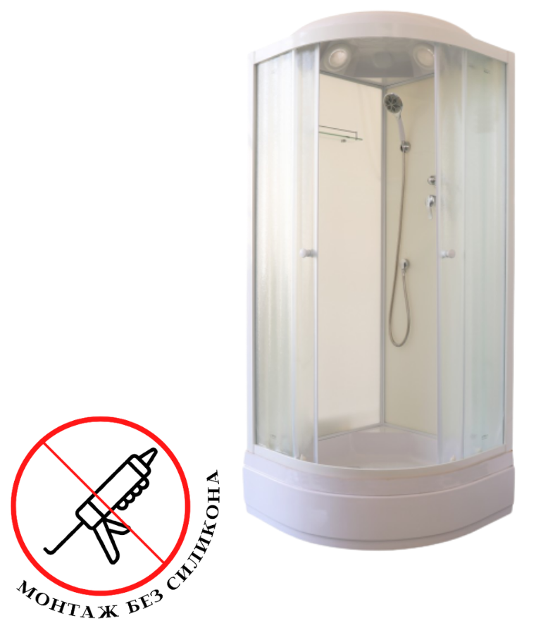 • Сборка без применения силикона. Конструкция душевой кабины обеспечивает слив воды внутрь поддона. Сам поддон по всему периметру оснащен водонепроницаемым бортиком высотой 2 см, который исключает перелив воды за пределы душевой зоны.