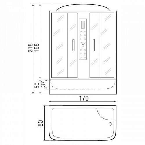 ~ крыша ~ верхний душ ~ верхн.свет ~ динамик ~ вентилятор ~центр/стойка зеркальная ~ лунный свет ~ пульт упр-я сенсорный ~ bluetooth ~ радио ~ смеситель с переключ. режимов ~ 11 г/м форс. на ц/ст. ~ набор воды ~поясничный. массажер ~ 6 г/м форс. на з/ст. ~ штанга ~ ручной душ 3-х позиц ~ зеркало ~ полка 2-х ярус. ~ подголовник ~ слив-перелив ~ поддон-ванна с/сид-ем с/съем.экр. (Н=50см)
