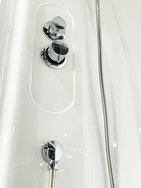 Душевая кабина RB 90BK2-Т сделает интерьер ванной комнаты уютным и функциональным. Прозрачные двери из стекла придадут интерьеру ванной комнаты воздушность, легкость и простор. Кабина оснащена гидромассажной системой из шести самоочищающихся форсунок. В основе конструкции лежит усиленный алюминиевый профиль который отвечает за прочность и устойчивость. Съемные подшипниковые ролики обеспечат аккуратное скольжение дверей. Для приема душа предусмотрены две лейки (верхняя и ручная), полочка, где можно расставить средства гигиены, а также встроенное сиденье, которое поможет отдохнуть или с удобством провести необходимые гигиенические процедуры. Комплектация: