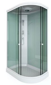 поддон низкий 15см фронтальные стекла: матовые фактурные задние стекла : белые матовые задняя панель: белый пластик белый алюминиевый профиль регулируемые ролики белые ручки для дверей 2 -режимный смеситель ручная лейка слив с сифоном крыша с верхней лейкой