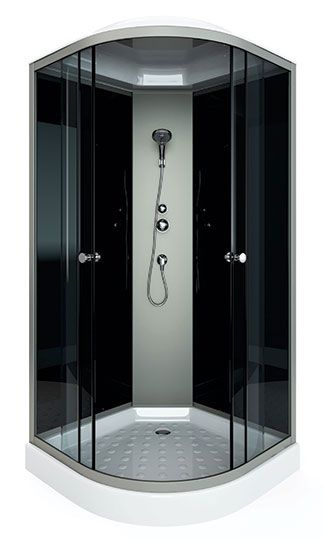 поддон низкий 15см фронтальные стекла : тонированные задние стекла : черные задняя панель серебро пластик хромированный алюминиевый профиль регулируемые ролики хромированные ручки для дверей 2- режимный смеситель ручная лейка слив с сифоном крыша с верхней лейкой