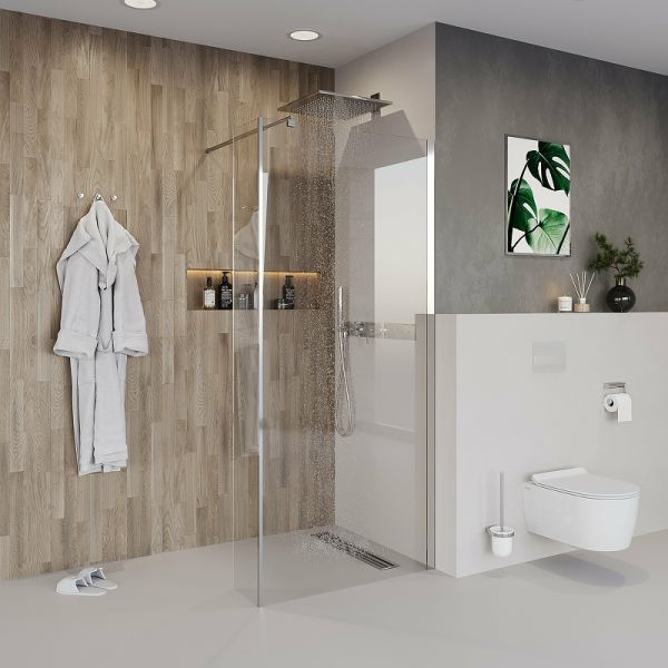 Это решение экономит место в ванной комнате. Также с помощью неподвижной стенки можно, например, отгородить стиральную машину, шкаф, раковину или унитаз.
