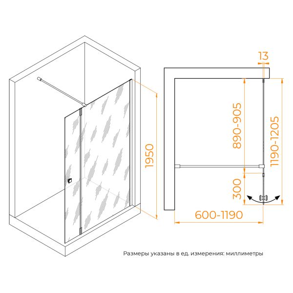 Душевая перегородка состоит из стационарного полотна и полотна с поворотной маятниковой частью - 300 мм. Стационарное стекольное полотно крепится к стене алюминиевым профилем с декоративной заглушкой. Подвижное полотно закреплено стальной маятниковой петлей с ходом 180 градусов.Перегородка выпускается с фурнитурой в 3-х вариантах: