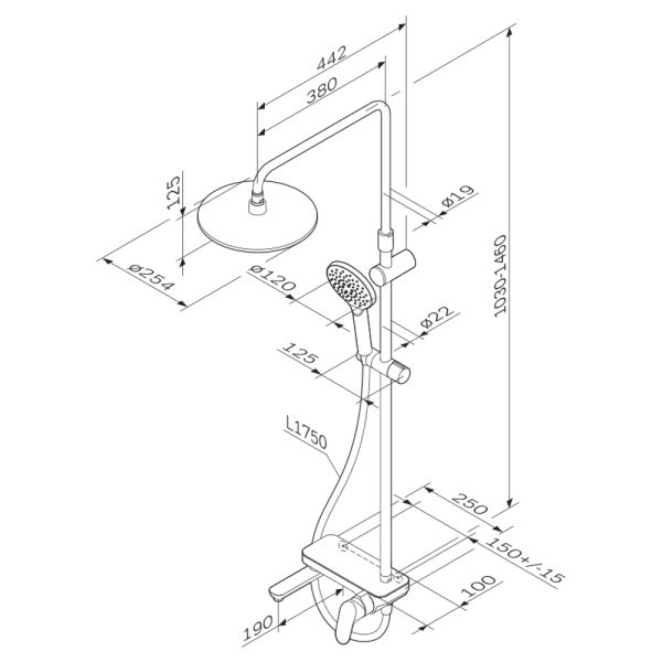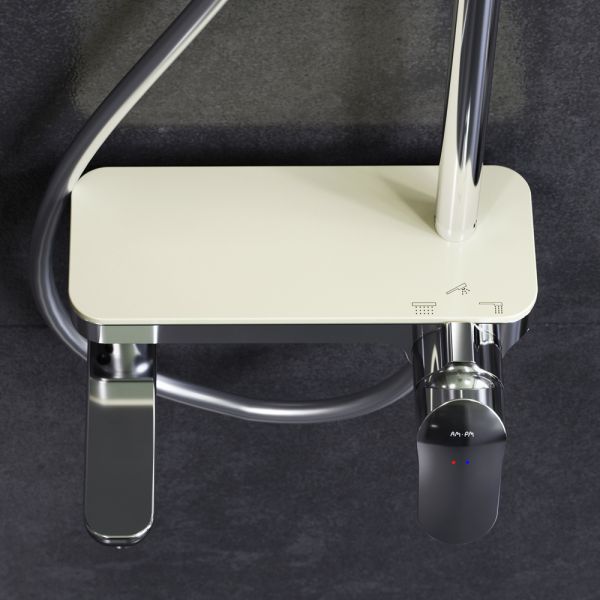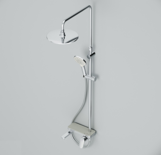 Тотальный дизайн в действии: все детали душевой системы – от пропорций ручного и верхнего душей до рисунка расположения форсунок на лейках.Премиальные размеры и продуманные детали: увеличенный диаметр душевых леек (верхний душ 254 мм и ручной душ 120 мм) позволит ощутить преимущества тропического душа, тогда как увеличенная длина шланга 1750 мм обеспечит свободу движений во время принятия душа. Телескопическая поворотная штанга регулируется по высоте в диапазоне от 1030 до 1460 мм, обеспечивая комфорт для людей любого роста, а шаровой шарнир в держателе верхнего душа позволяет регулировать угол его наклона.Смеситель выполнен в виде полочки. Чистый дизайн без лишних деталей: переключатель расположен за ручкой настройки температуры и позволяет менять источник потока воды от ручной лейки и излива до верхнего душа.