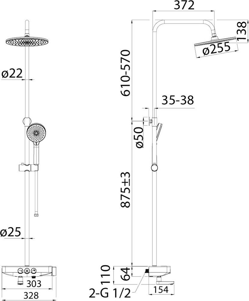 Размер верхнего душа: 25.5 см