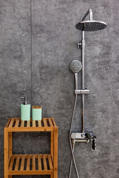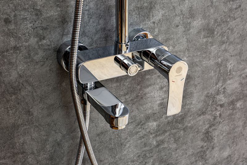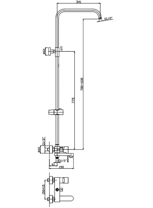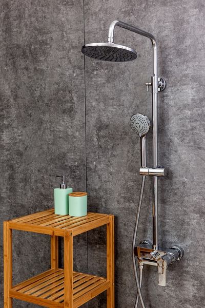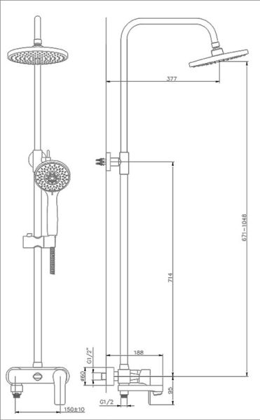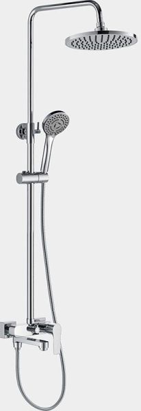 Душевая система в комплекте: смеситель с изливом (190 мм), телескопическая штанга (880-1200 мм), верхний душ (200 мм) с регулируемым углом наклона и силиконовыми наконечниками для простого удаления известкового налёта, трёхрежимный ручной душ, регулируемый по высоте и углу наклона держатель ручного душа, растягивающийся душевой шланг 1500-1800 мм в металлической оплетке (с защитой от перекручивания). Переключение на душ осуществляется с помощью поворота излива. Цвет глянцевый хром.