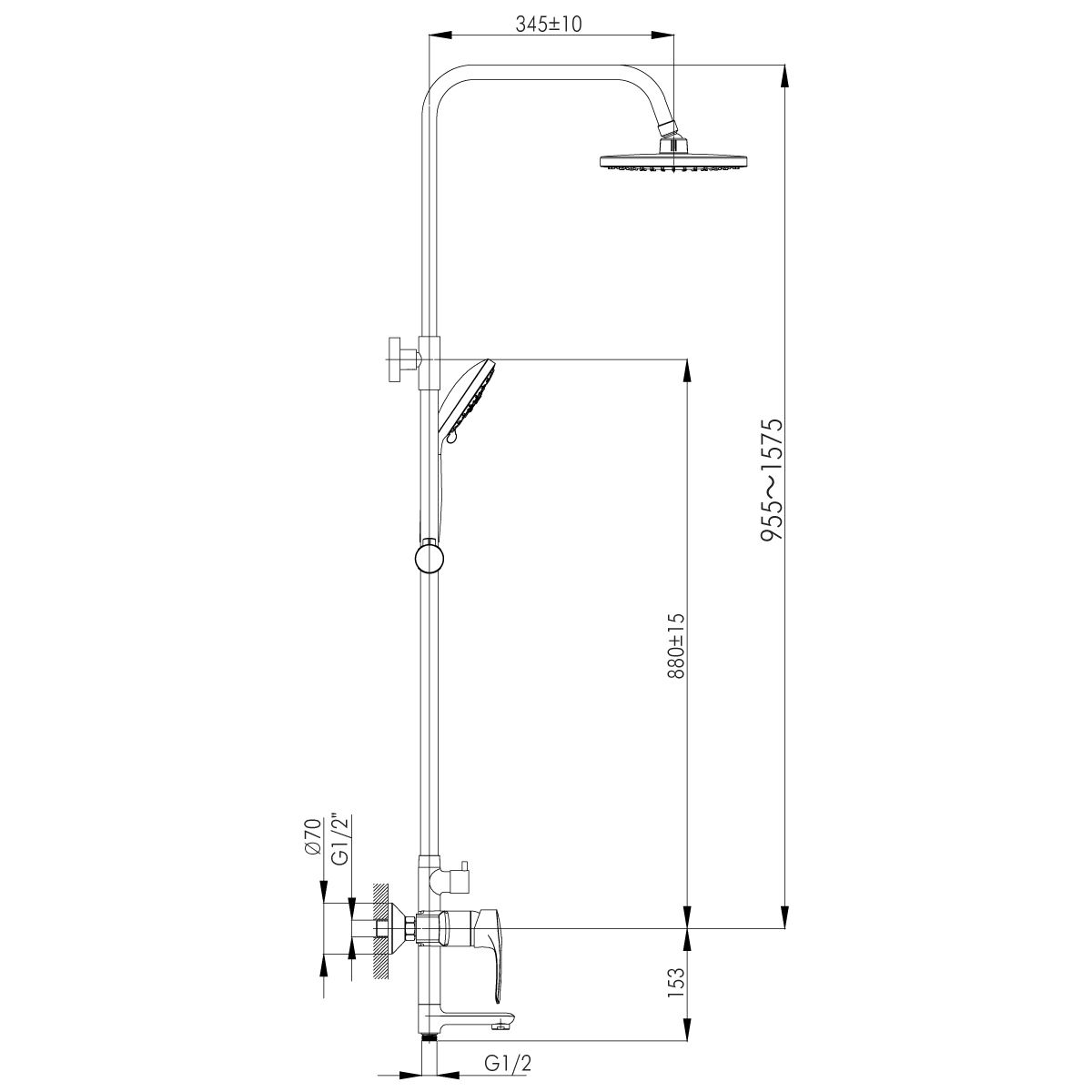 Душевая система с регулируемой высотой штанги, поворотным изливом 97 мм и верхней душевой лейкой Тропический дождь. Аксессуары в комплекте (шланг 1,5 м, 5-функциональная лейка с функцией легкой очистки, регулируемое по высоте крепление для лейки).