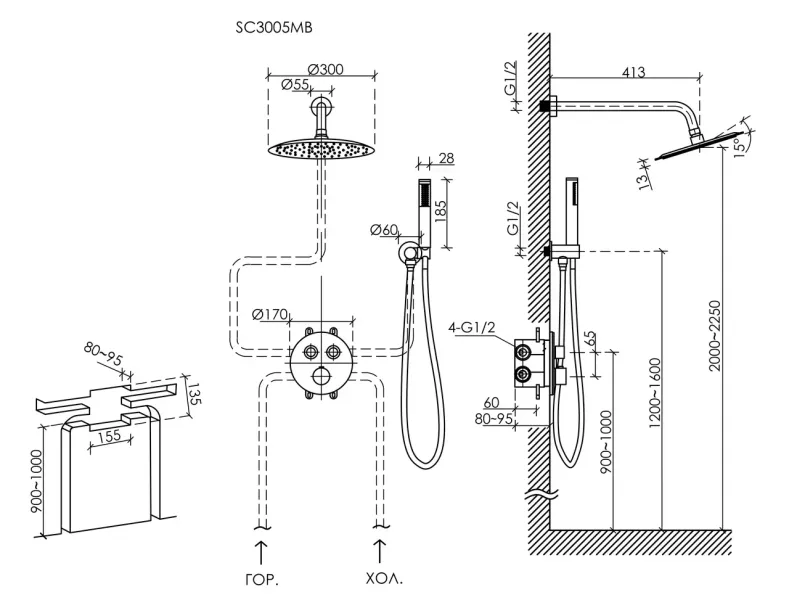 Душевой комплект SANCOS Link встраиваемый, c термостатическим смесителем, верхним, ручным душем и шлангом в комплекте, цвет черный матовый, арт. SC3005MB