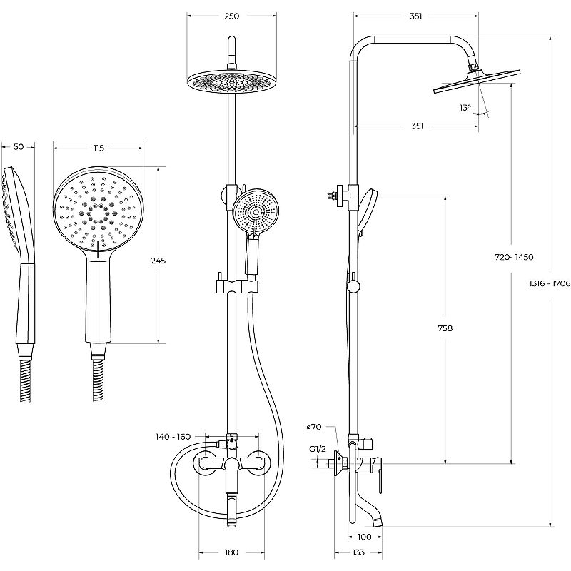 Регулируемая высота верхнего душа.